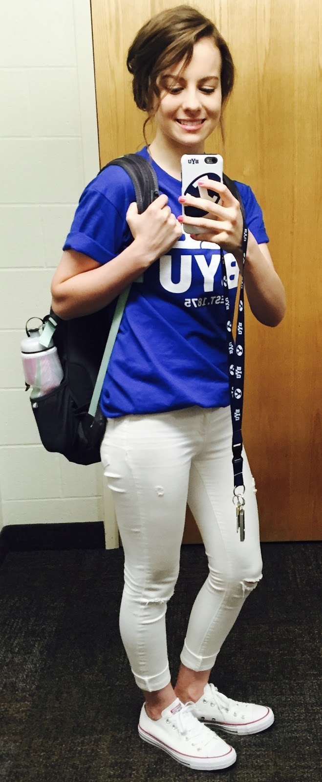 Our first FHE was on Monday, which was fun, but kind of stressful for me because I had just gotten back from the gym and was a bit late. (To all of those who know how late I was to everything in high school, this was actually the first thing that I have been late to here at BYU!) It was pretty fun, we played a game called smurf. Basically you just have to come up with a verb, and send someone out while you think of it. When they come back, they have to ask the group questions like, "can you smurf in the kitchen?" Our verb was brushing your teeth, and one of the questions was, "do you invite your friends over to surf?" Later that night, Karinne and I took a picture of ourselves "smurfing" and sent it out on our FHE group chat. No one responded... (Karinne and I have accepted and fully, joyfully embrace the fact that we are hopeless dorks.)